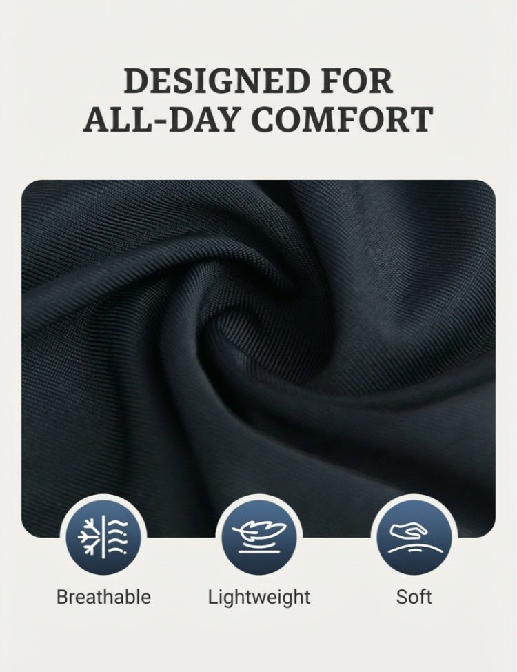 ➤ Supreme Comfort: Flow through your day with fabric that breathes and flexes with every move — no tight spots, just freedom.