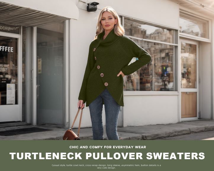- FEATURES: Women's Knit pullover sweater, cozy and chunky, casual style, high neck, cross wrap design, asymmetrical hem, decorative buttons.