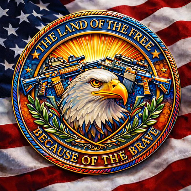 The reverse displays a fierce bald eagle at the center, symbolizing strength, vigilance, and national pride. Rifles form a powerful backdrop, representing defense and resolve, while olive branches add balance and remembrance. The surrounding text “THE LAND OF THE FREE · BECAUSE OF THE BRAVE” reinforces the message that freedom is earned through courage.