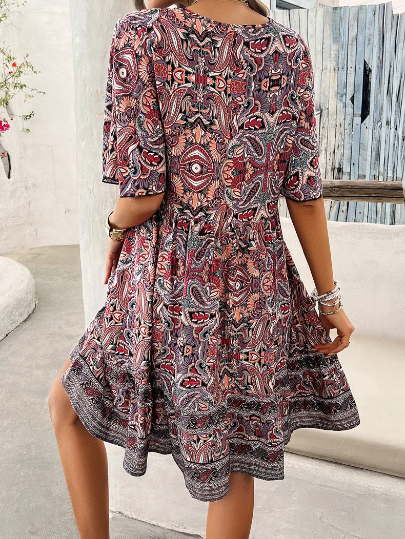 Women's Bohemian Contrast Print V-Neck Short Sleeve Dress