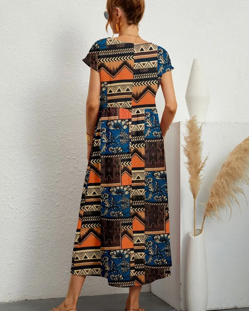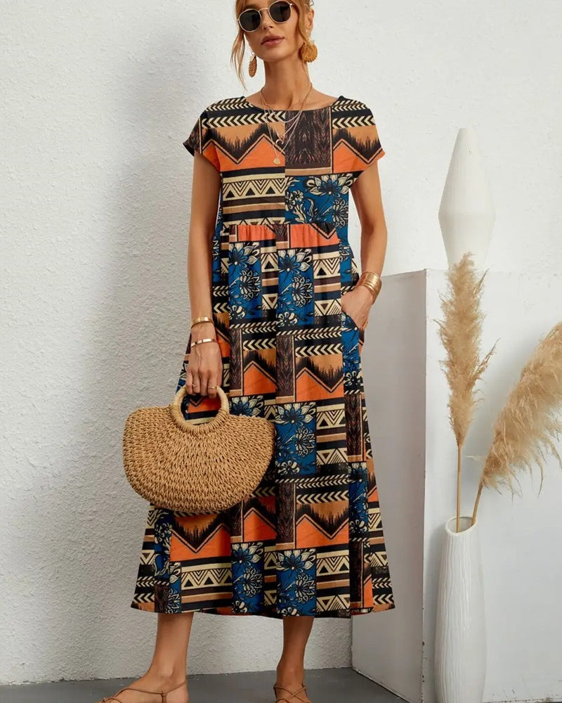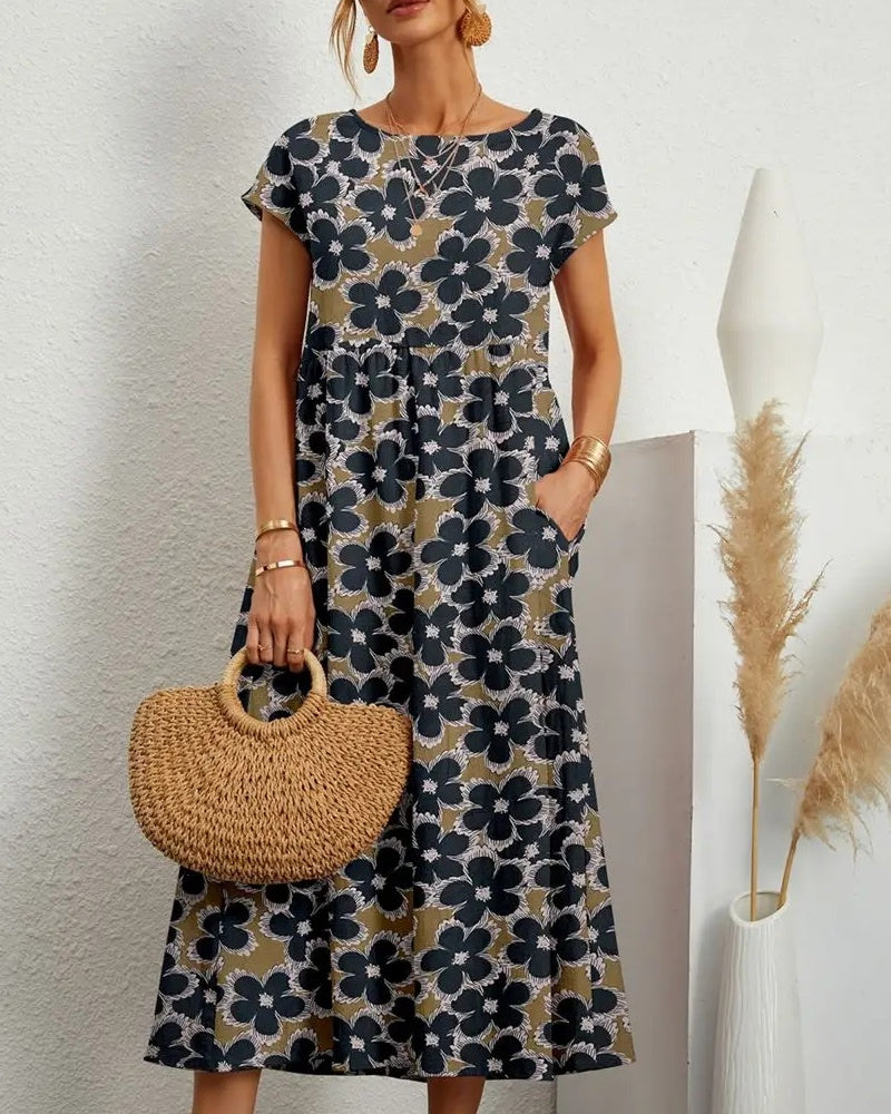 Women's Loose-Fit Crew Neck Floral Print Dress with Pockets