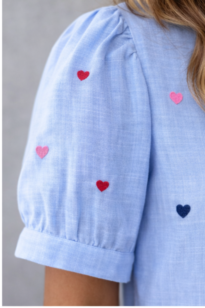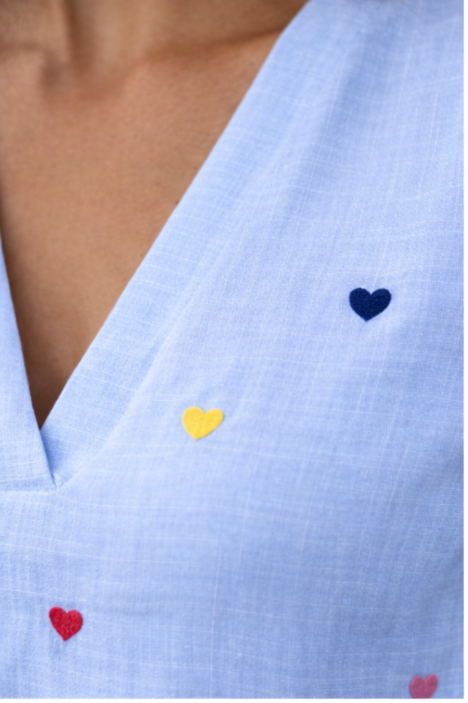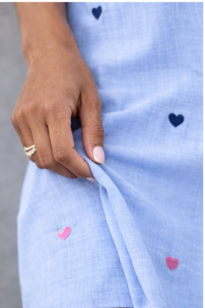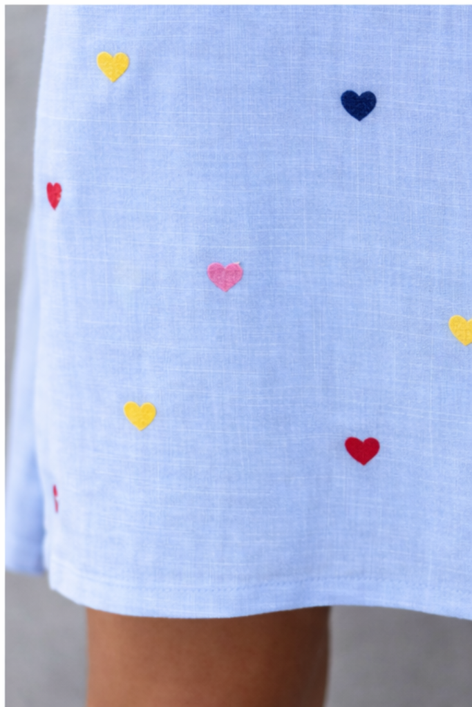 The dress features colorful heart embroidery that adds a playful and feminine touch, making it a perfect choice for casual and stylish looks.